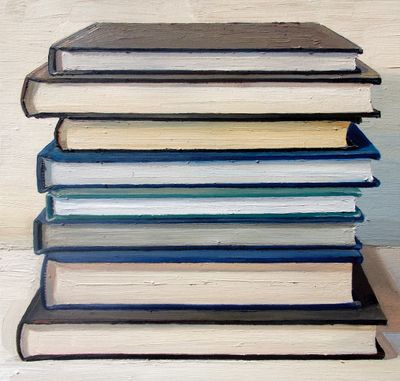 From first glimpse the painting on the gallery website caught my attention. The image was books, spines turned away from us, stacked one on top of another. In two seconds the painting, the size of a postage stamp on the website, revealed itself to me. It wasn’t about the books. It was about the holy, serene space in which the books existed.
